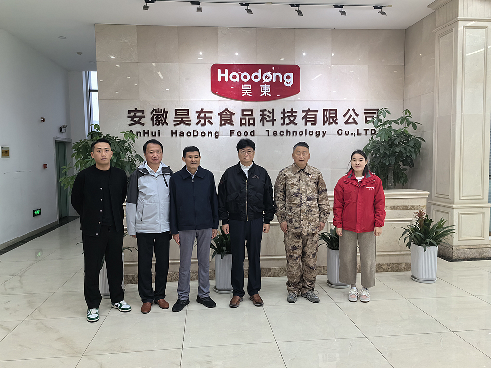 中國旅游協(xié)會旅游商品與裝備分會秘書長陳斌(左4)、廬江縣人大常委會專職常委夏曉東(左3)、廬江縣旅游協(xié)會會長朱焊群(左2)蒞臨昊東食品