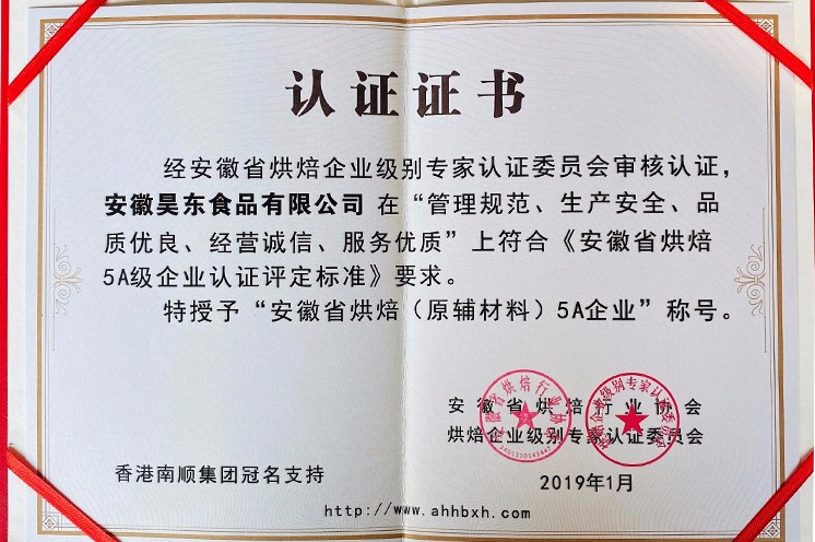 • 安徽省烘焙(原輔材料)5A企業(yè)